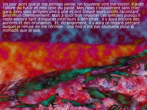Lorsque l’on me demande ce que je suis, d’où je viens je sais que ma réponse choquera alors je ne réponds tout simplement qu’avec un sourire. Je ne me sens ni Marocaine, ni Algérienne, ni Canadienne et encore moins citoyenne du Bourg de Liesberg ou de Santiago de Cuba. Je n’ai d’attaches que celles de sang et encore, mon legs génético-culturel est un tel capharnaüm qu’il serait présomptueux d’avantager une de mes origines. Elles sont entrelacées et à jamais inextricables alors à quoi bon me jouer la carte des origines puisque je ne fais que passer comme mes ancêtres. Avec les années, j’ai compris qu’il ne servait à rien d’imaginer ce qui aurait pu être. Dans cette besace qu’est ma tête, je trimballe mon histoire, leurs histoires, la somme de ce que je suis. Je scrute le ciel et me surprends à souhaiter qu’il neige à nouveau.